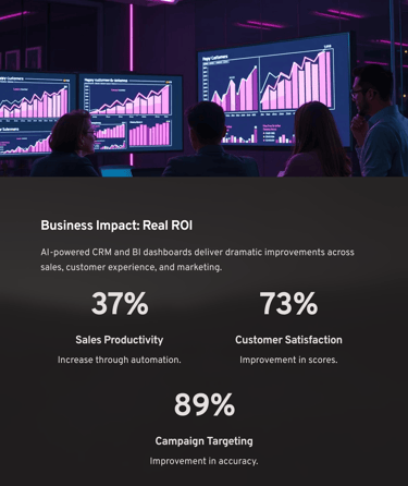 The results speak for themselves. Businesses implementing AI-powered CRM and BI dashboards consistently see dramatic improvements across key metrics: