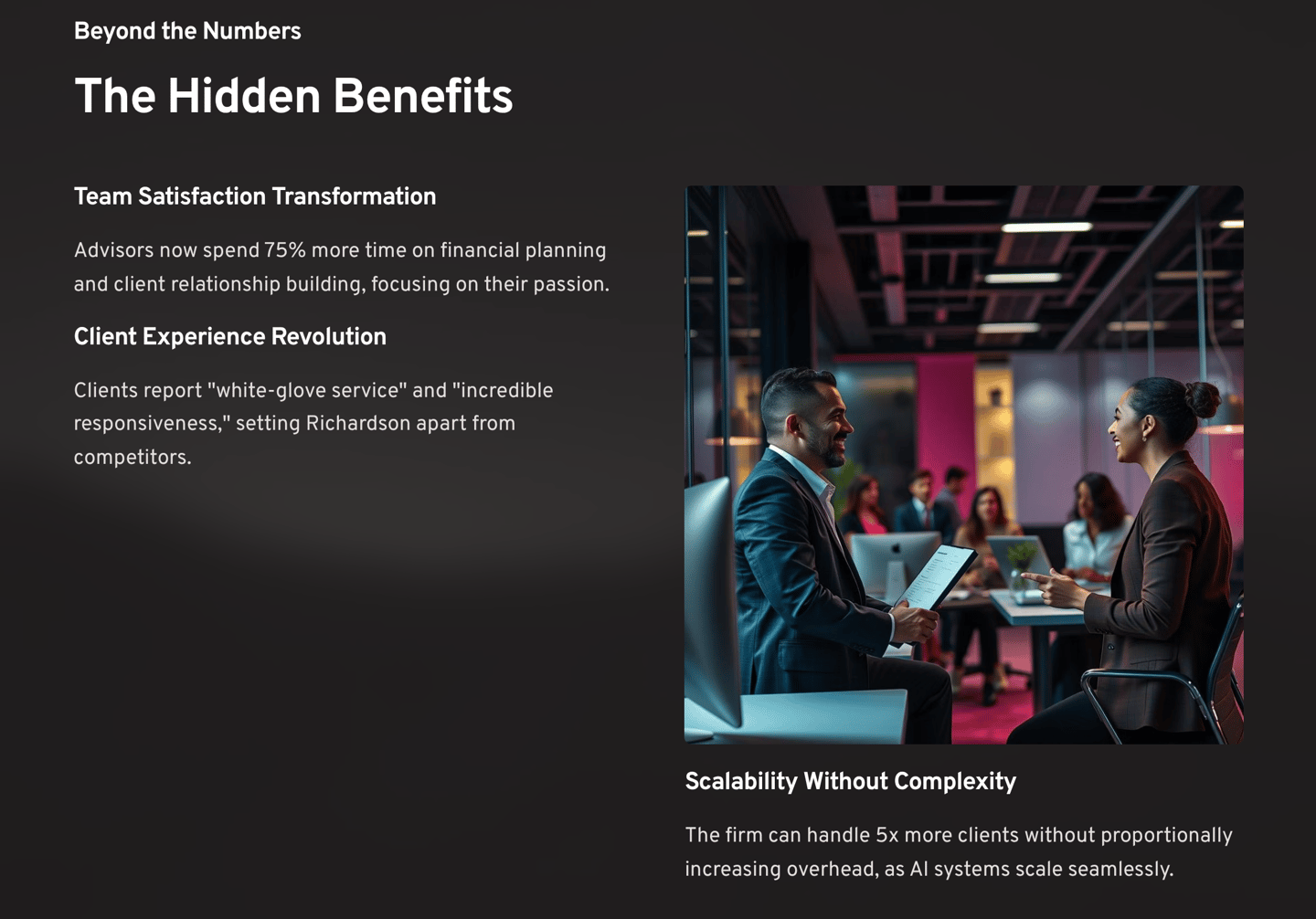 Team Satisfaction Transformation "Our advisors went from feeling overwhelmed to feeling empowered," explains David. "They're spending 75% more time on actual financial planning and client relationship building—the work they're passionate about."