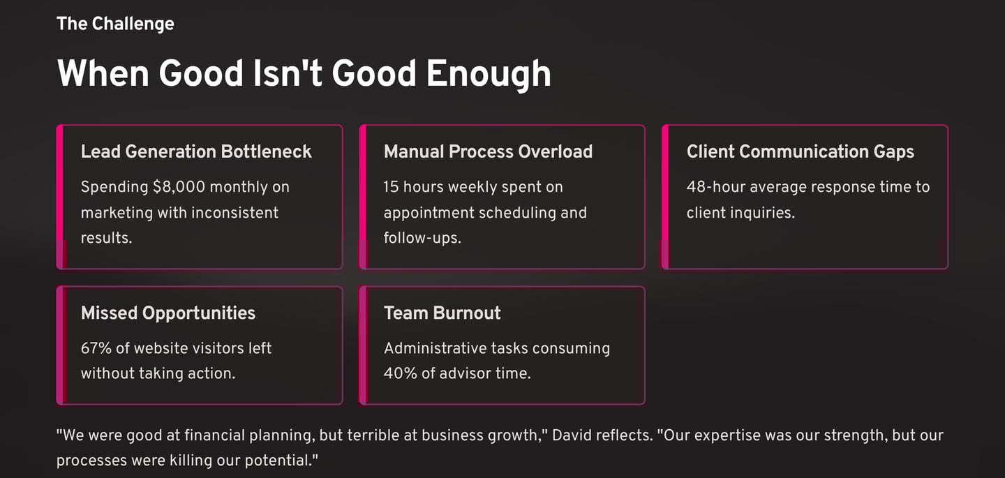 "We were good at financial planning, but terrible at business growth," David reflects. "Our expertise was our strength, but our processes were killing our potential."