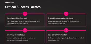 Scalability Without Complexity The firm could handle 5x more clients without proportionally increasing overhead costs. The AI systems scaled seamlessly, maintaining service quality as the client base expanded.