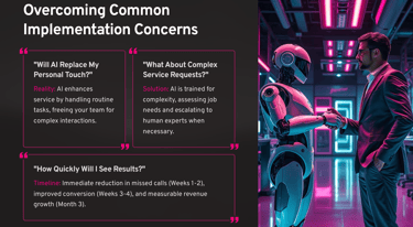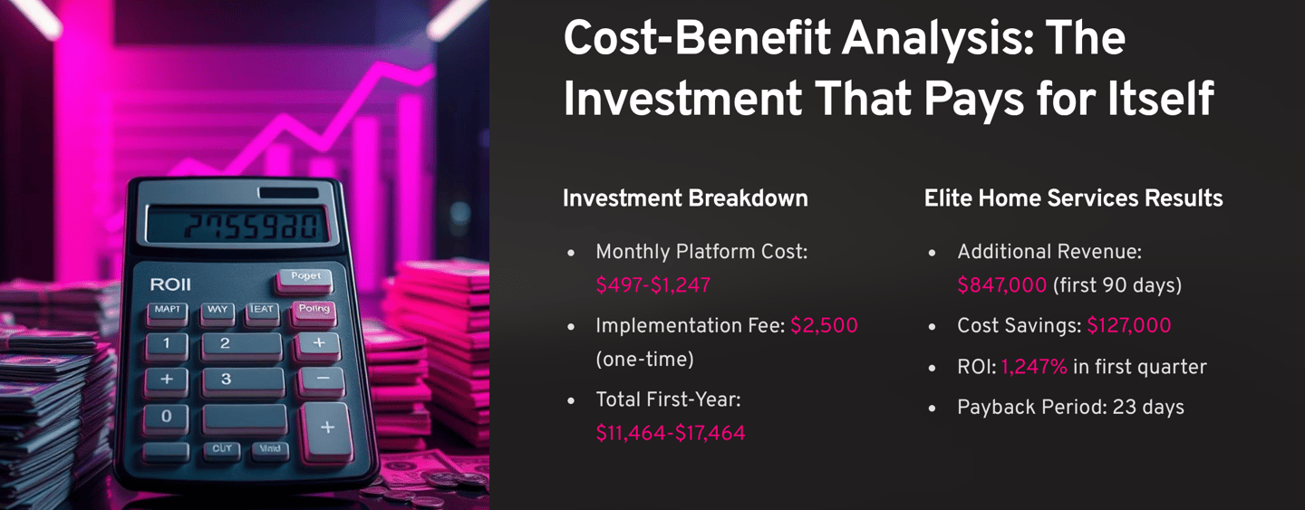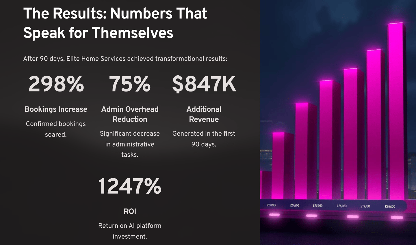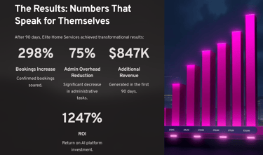 The Result? After implementing our comprehensive AI platform, Elite Home Services achieved a 298% increase in confirmed bookings within just 90 days, while reducing administrative overhead by 75%.