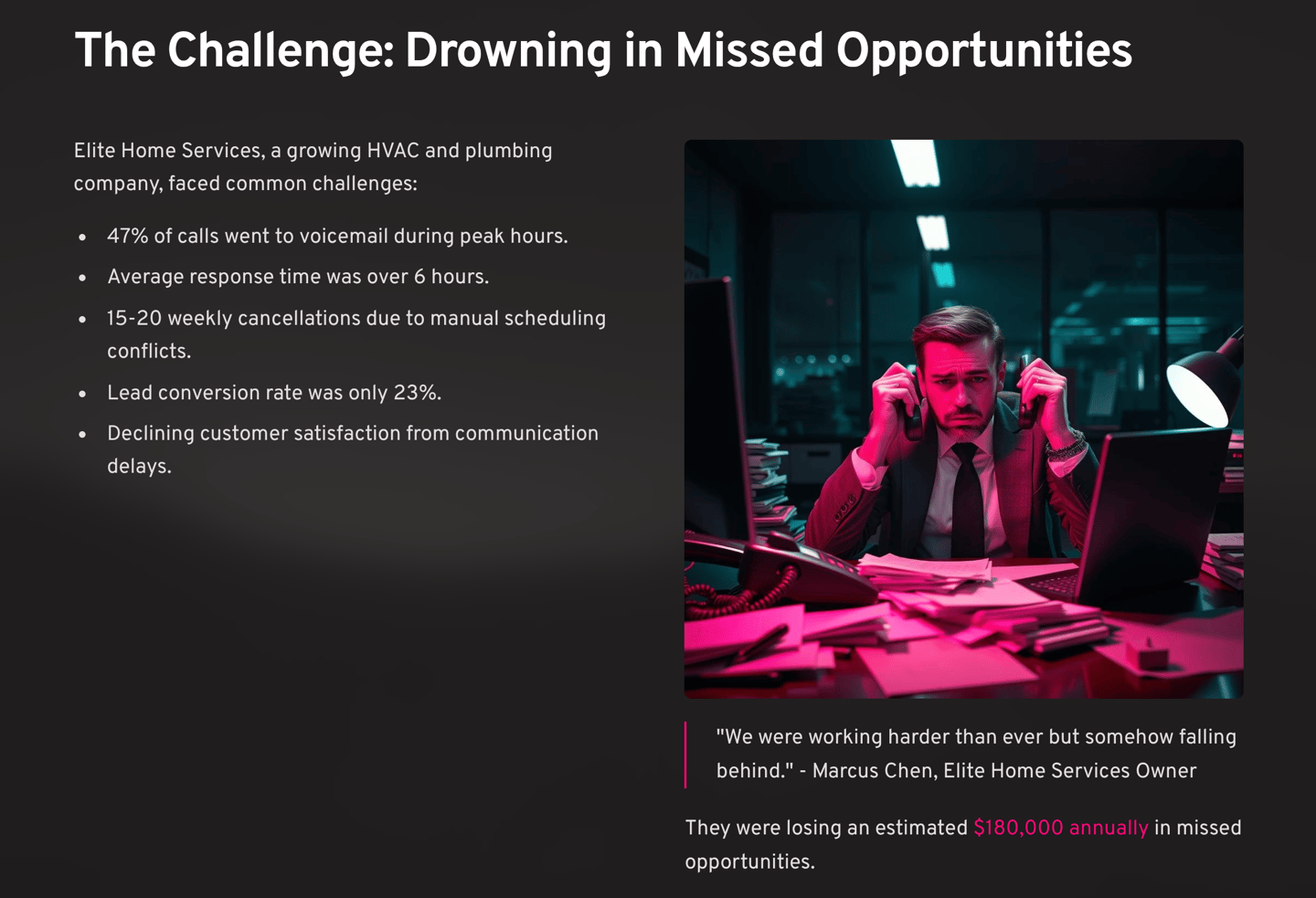 "We were working harder than ever but somehow falling behind," Marcus explains. "My office manager was overwhelmed, customers were frustrated with our slow response times, and I knew we were losing business to competitors who could answer their phones faster."