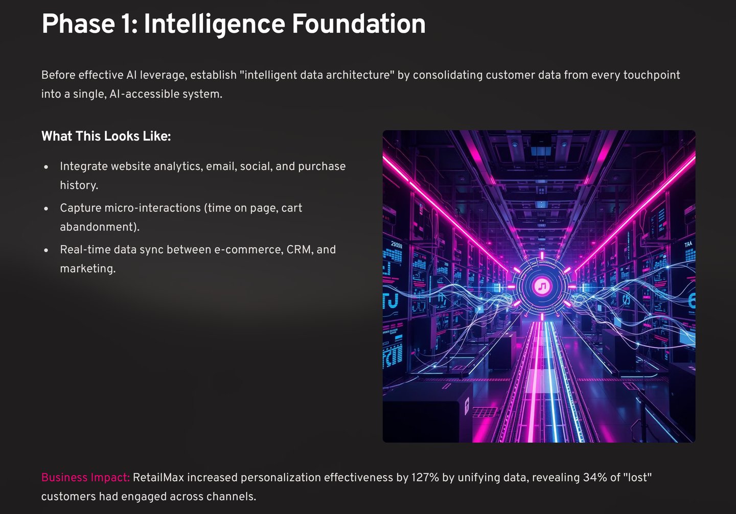 Before you can leverage AI effectively, you need what we call "intelligent data architecture." This means consolidating customer data from every touchpoint into a single, AI-accessible system.