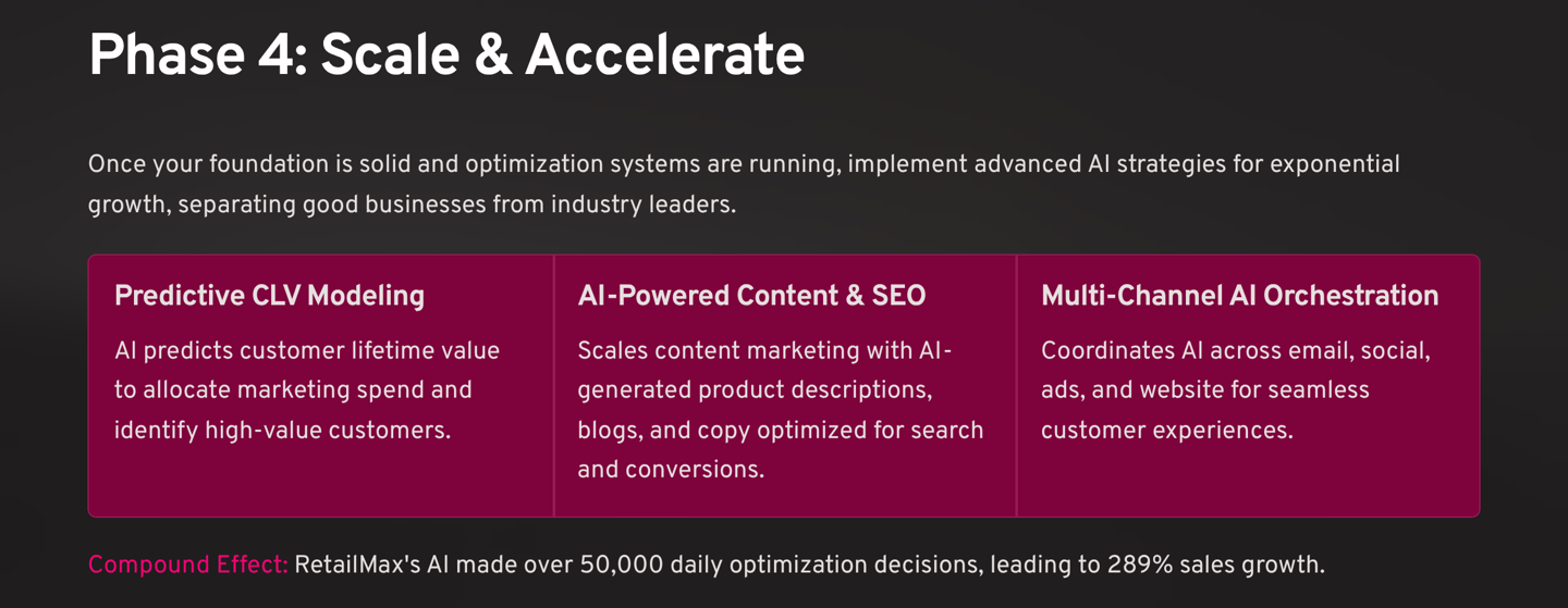The Compound Effect in Action: When RetailMax reached Phase 4, their AI systems were making over 50,000 optimization decisions daily. The compound effect of these micro-improvements resulted in the dramatic 289% sales growth over 18 months.