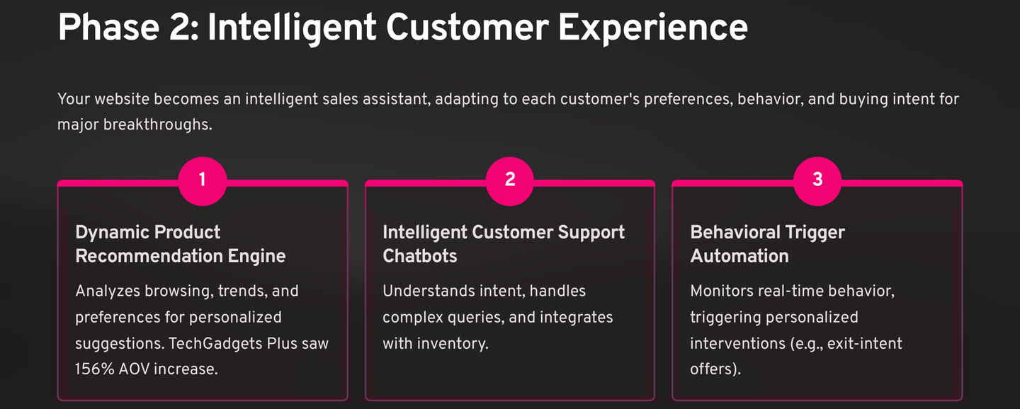 This is where most businesses see their first major breakthrough. Instead of treating every visitor the same, your website becomes an intelligent sales assistant that adapts to each customer's preferences, behavior, and buying intent.