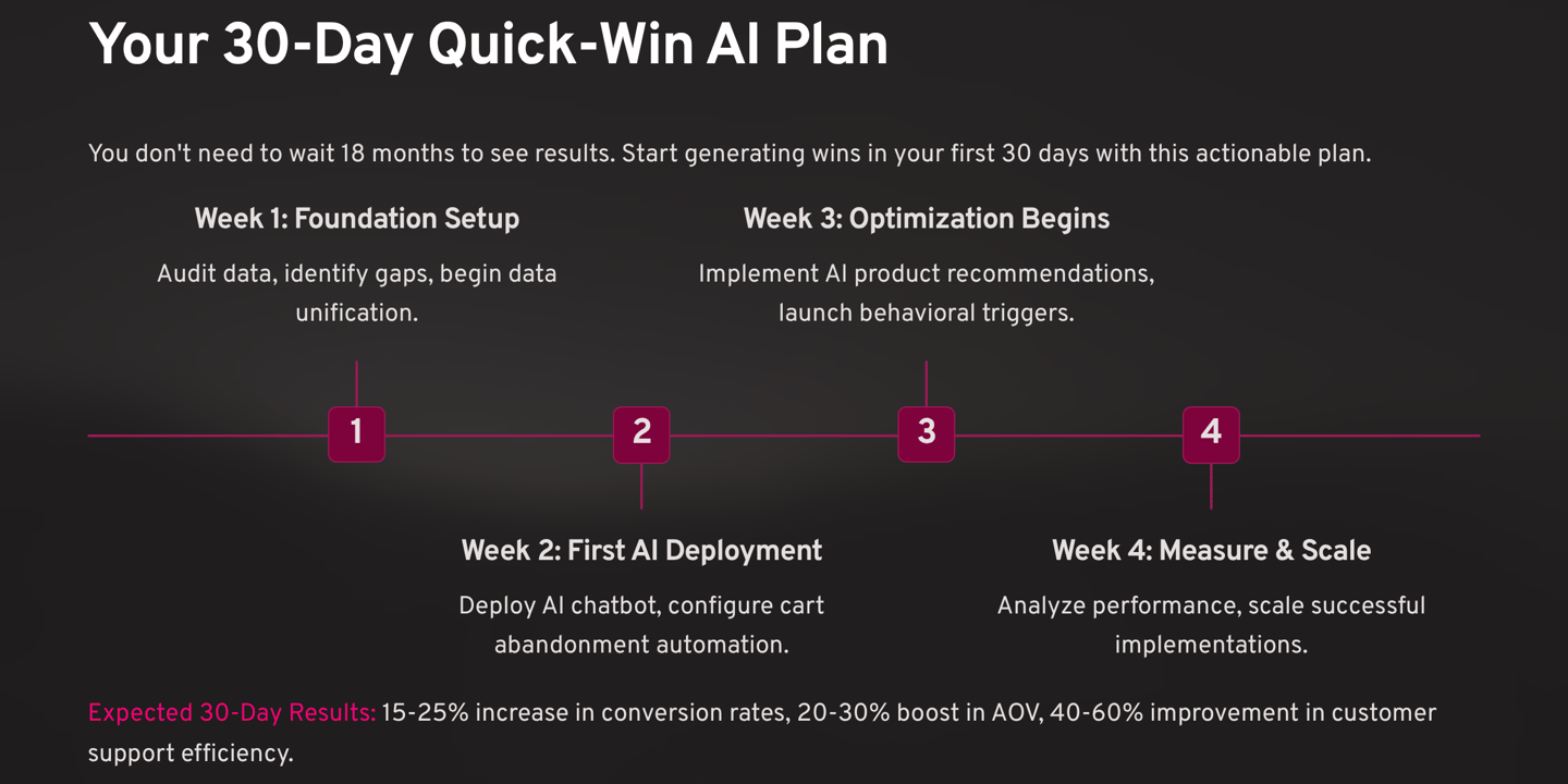 Week 1: Data foundation and integration planning Week 2: Deploy first AI system (recommend starting with chatbot or abandoned cart automation) Week 3: Implement personalization engine for product recommendations Week 4: Launch behavioral trigger campaigns and measure initial results