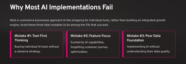 Mistake #1: Tool-First Thinking Instead of Strategy-First Planning They buy an AI chatbot here, a recommendation engine there, and wonder why their results are mediocre. Without a cohesive strategy, you're just adding expensive complexity to your business.