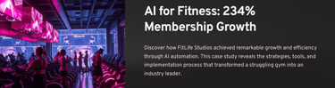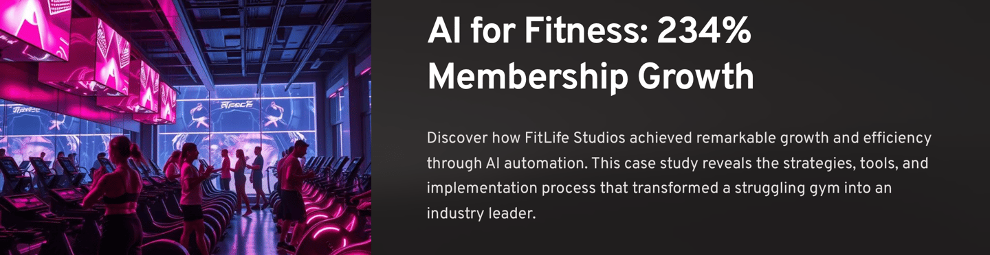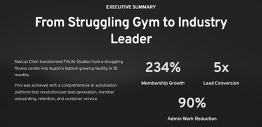 Discover how FitLife Studios used AI automation to achieve 234% membership growth, 5x lead conversion, and 90% reduced admin work. Real fitness business transformation results.