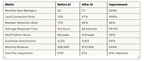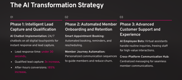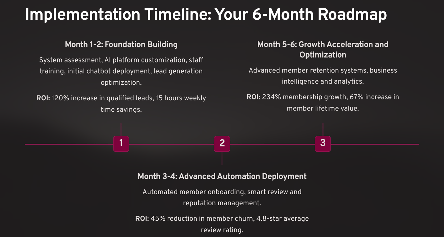 30 Days: Noticeable improvement in lead response and conversion 60 Days: Significant reduction in administrative workload 90 Days: Measurable improvements in member retention and satisfaction 180 Days: Substantial revenue growth and operational transformation