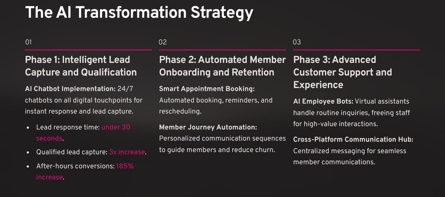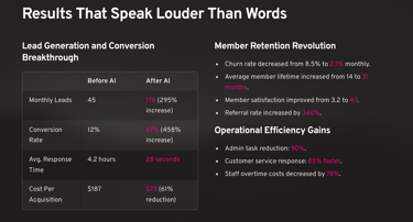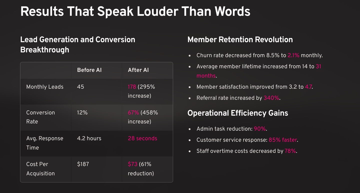 The secret? A comprehensive AI automation platform that transformed every aspect of his business operations—from lead generation and member onboarding to retention and customer service.