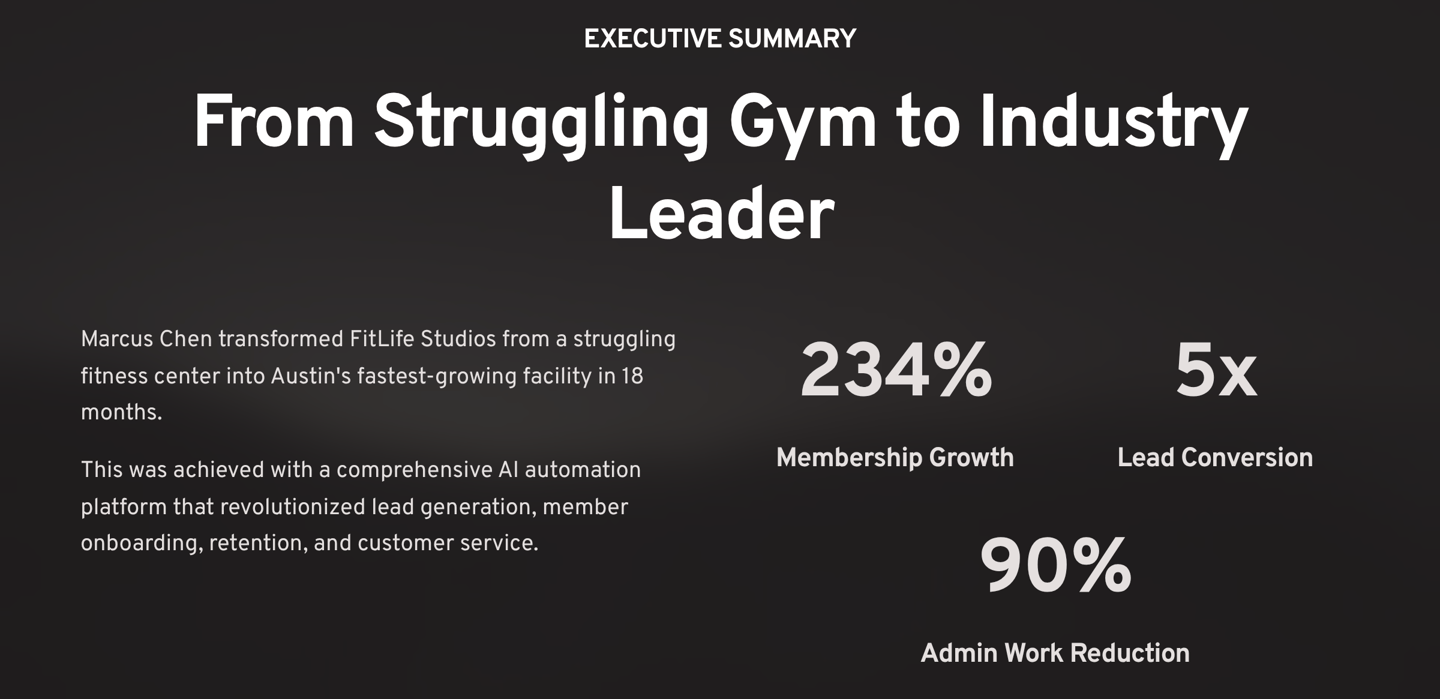 When Marcus Chen bought FitLife Studios in early 2023, he inherited a struggling fitness center with declining membership, overwhelmed staff, and outdated systems. Eighteen months later, his gym has become the fastest-growing fitness facility in Austin, Texas, with 234% membership growth, 5x higher lead conversion rates, and 90% reduction in administrative tasks.
