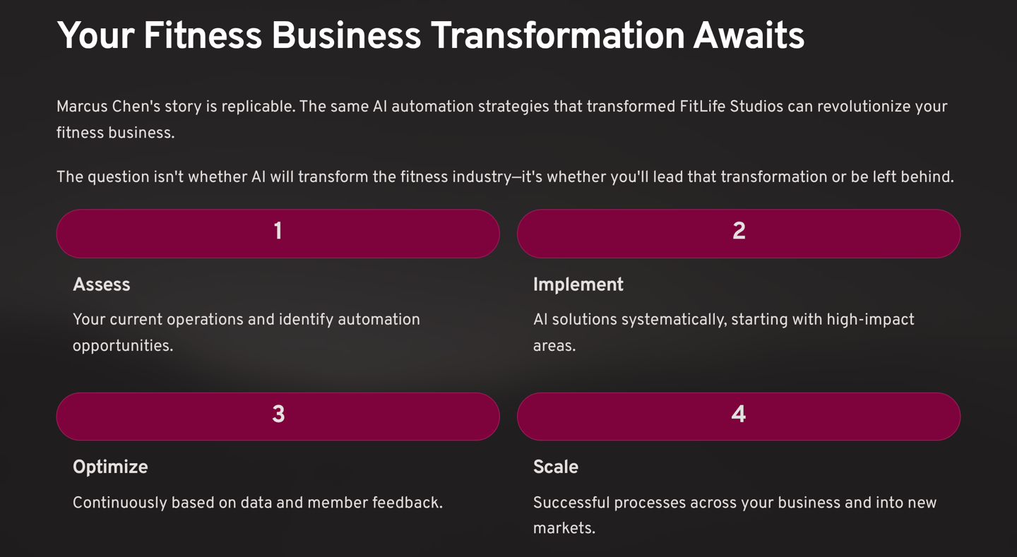 Marcus Chen's story isn't unique—it's replicable. The same AI automation strategies that transformed FitLife Studios can revolutionize your fitness business, regardless of size, location, or current challenges.