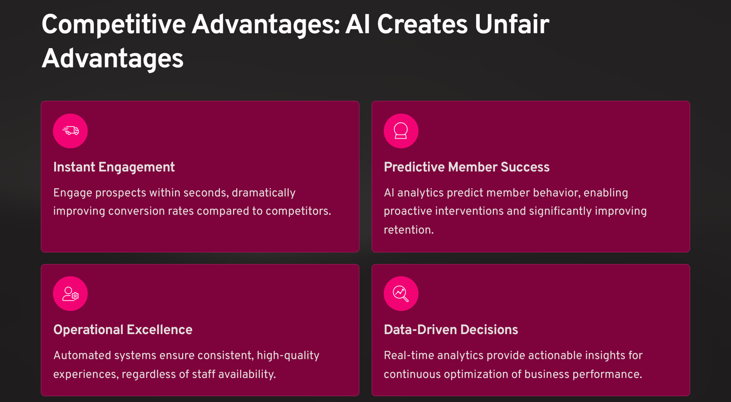 The fitness industry is experiencing a technological revolution. Business owners who embrace AI automation now will dominate their markets while those who wait will struggle to catch up. The question isn't whether AI will transform the fitness industry—it's whether you'll lead that transformation or be left behind.