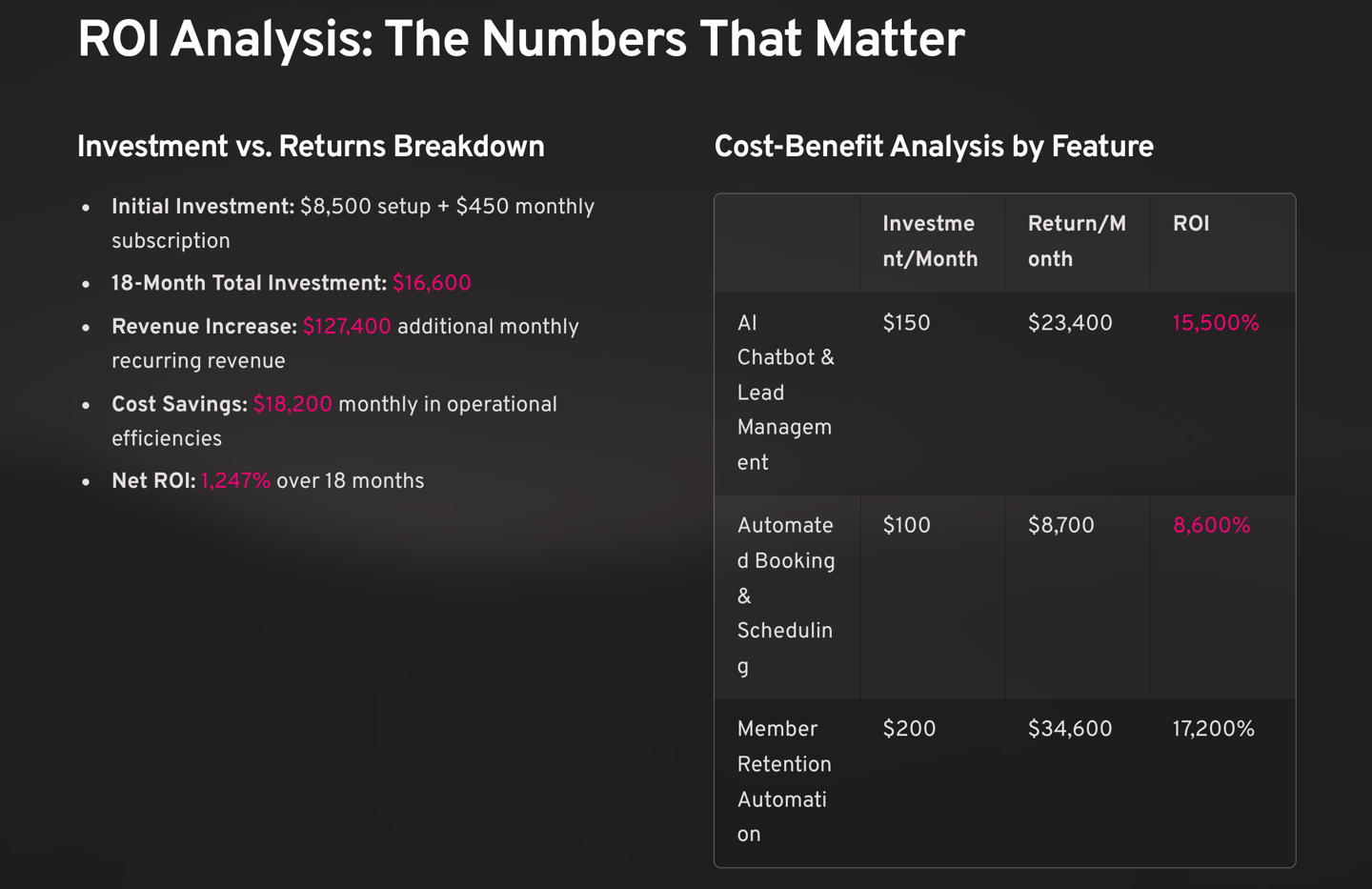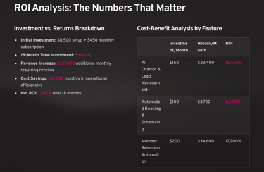 Q: What's the typical ROI timeline for fitness businesses? A: Most clients see positive ROI within 60-90 days. The average 18-month ROI for fitness businesses is 800-1,200%, with many achieving results similar to FitLife Studios' 1,247% return.