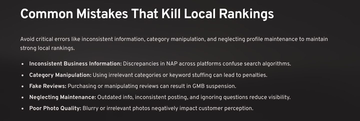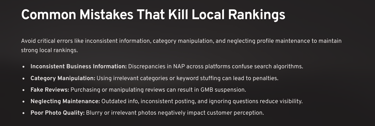 Phone Number Strategy: Use a local phone number whenever possible. Google prefers local numbers and customers trust them more. If you have multiple locations, each should have its own unique phone number. Avoid using call tracking numbers as your primary GMB number, as frequent changes can harm your rankings.