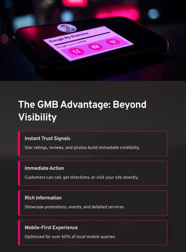 Google My Business offers something that traditional marketing channels can't: immediate credibility and instant accessibility. When your GMB profile appears in local search results, you're not just getting visibility—you're getting: