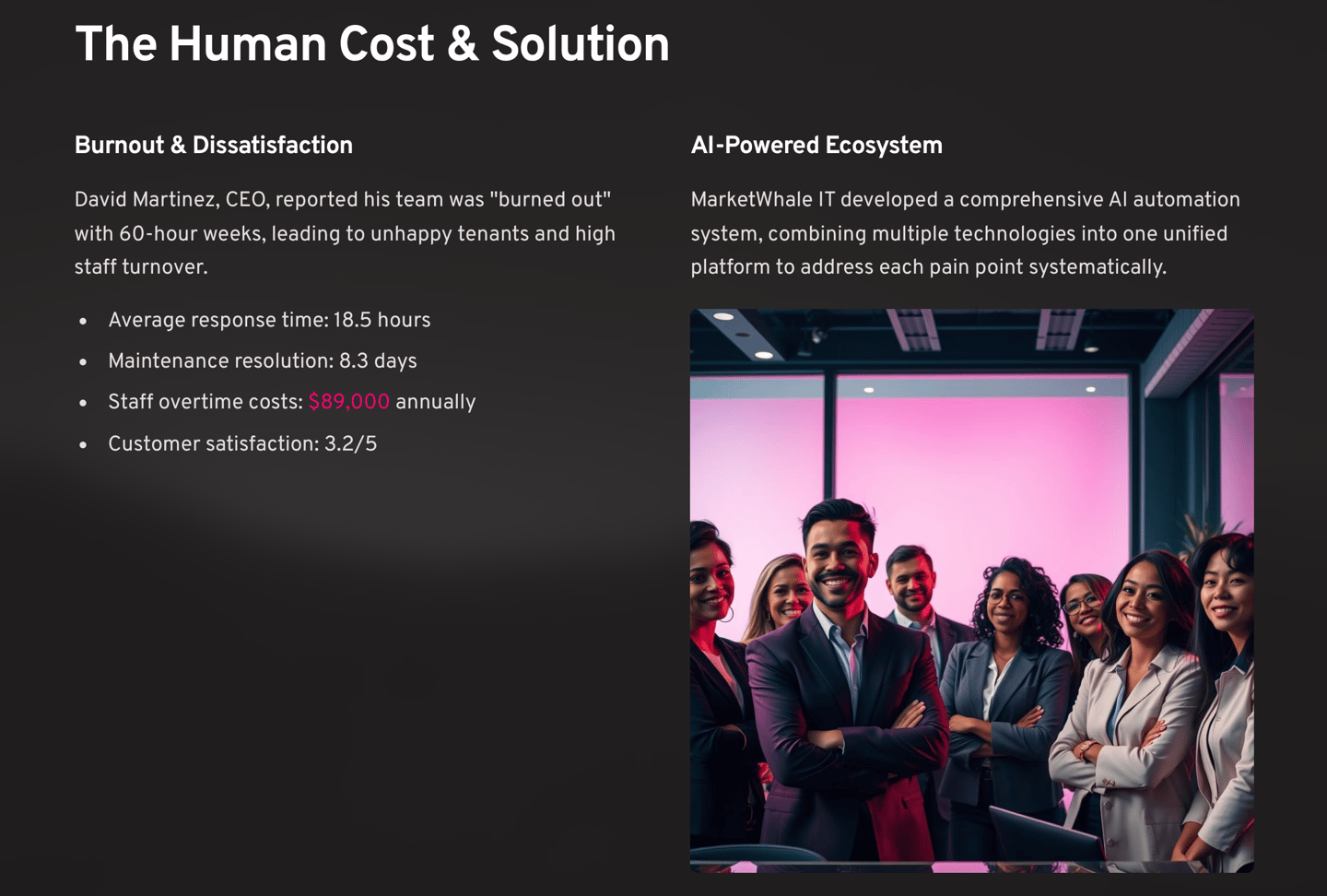 "My team was burned out," David shared during our initial consultation. "We had property managers working 60-hour weeks, and still, tenants were unhappy. Something had to change, or we'd lose our best people."