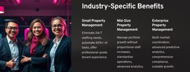 Q: What are the main benefits of AI for property management? A: Primary benefits include 24/7 tenant communication, automated maintenance scheduling, predictive analytics for preventive maintenance, streamlined rent collection, and improved tenant satisfaction scores. Most companies see ROI within 60-90 days.
